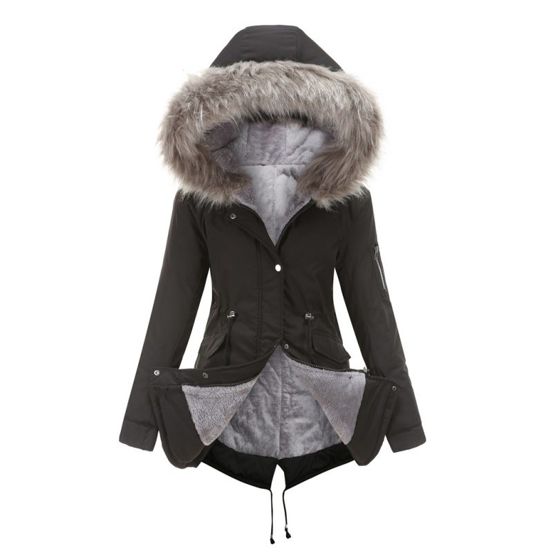 Winter Slim Long Jacket With Fur Hood And Belt Fashion Solid Hooded Coat Warm Clothing For Women — Black With Smooth Color