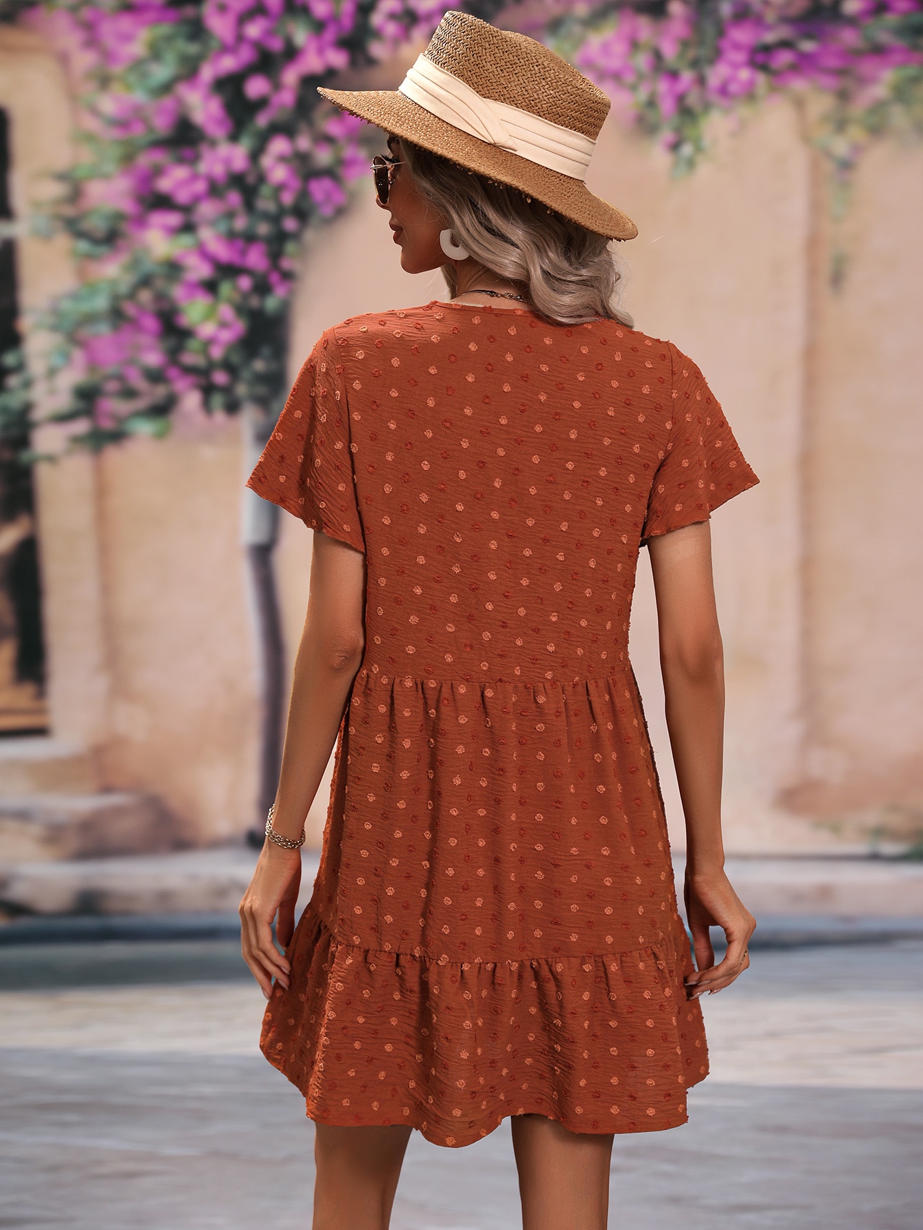 Dot Butterfly Sleeve Ruffle Hem Smock Dress — Rust Brown