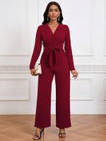 Simple And Stylish, Elegant Commuting Jumpsuit, Long Sleeve Straight Jumpsuit, V-neck, Cross Pleated, Tie-up Casual Jumpsuit, For Everyday Wear. — XS
