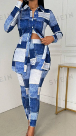 Be the first to review “Women’s Shirt Collar Long Sleeve Knit Denim Effect Top And Pants Set — Blue” Cancel reply